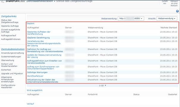 Um zu prüfen, ob auch kein TimerJob mehr läuft bzw. geplant ist, kann in der Zentraladministration der Auftragsstaus geprüft werden.