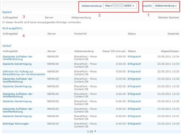Um das Ergebnis zu prüfen kann wieder in der Zentraladministration der Auftragsstatus überprüft werden. Im Bereich Geplant sollten nun wieder die anstehenden TimerJobs aufgeführt sein.