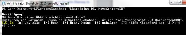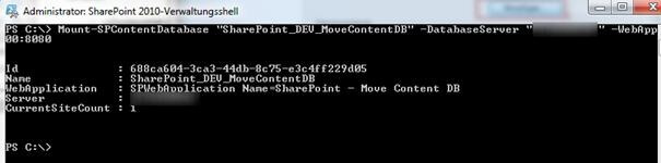 Hier benötigen wir den in Schritt 1 ermittelten Datenbanknamen. In unserem Fall SharePoint_DEV_MoveContentDB. Mit dem Powershellbefehl: