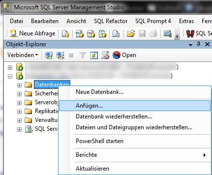 Dazu wieder das SQL Management Studio öffnen, rechter Mausklick auf den Datenbankenknoten und den Befehl Anfügen wählen: